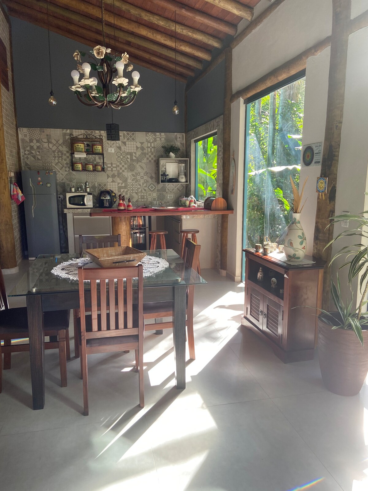 Kuća je integrisana u šumu, u krošnjama drveća, sa pogledom na more, unutar kondominijuma, na brdu u desnom uglu Praia do Feliks, u najljepšem i očuvanom dijelu opštine Ubatuba. Ovde se probudite uz zvuke Atlantske šume i talasa. Postoje 3 apartmana, viseće ležaljke, sofe, TV sa DVD-om, brzi internet i roštilj. Ovo je savršen dom za one koji žele da uživaju u miru i prirodi, sa svim spokojem svijeta.