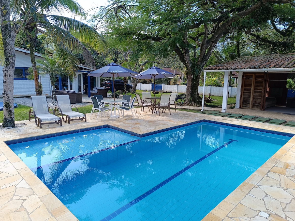 🏝️ Nalazi se na samo 4 minuta hoda od plaže, unutar kondominijuma Itamambuka, jednog od najbezbednijih u Ubatubi! Kompletna 🍽️ infrastruktura sa šarmantnim restoranima, prodavnicama sladoleda, prodavnicama, pijacom i pekarom . Nevjerovatna spoljna 🌿 površina od 500 m2 sa: • Prelepi bazen prekriven pločicama • Peć za roštilj i picu • Zelena površina sa autohtonom šumom, palmama i travnjakom za uživanje u prirodi. 🛏️ Ima 4 apartmana i 2 manje spavaće sobe, sve sa klima-uređajem. 👪 Može da spava do 23 osobe!