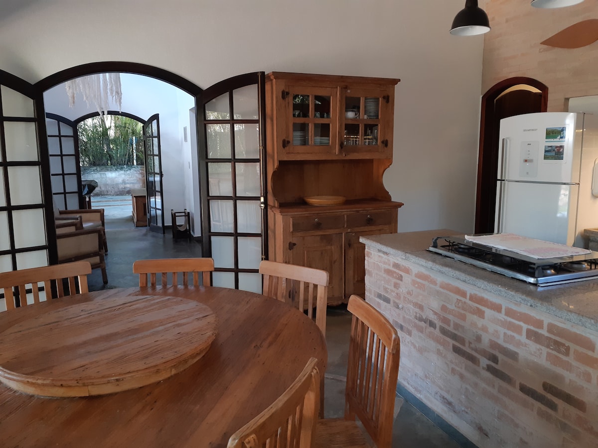 Casa confortável e charmosa ,integrada à natureza,distante 3 minutos a pé da praia.Possui TV a Cabo e Internet / WiFi de 120 M . Ambiente com sala de estar,mesa de bilhar e cozinha americana.Piso superior com sala de TV. Há uma vaga de garage coberta para um carro e outra descoberta para mais um carro . Quintal dos fundos com churrasqueira e com portão lateral que impede acesso para a parte da frente da casa . Não oferece roupa de cama e banho.