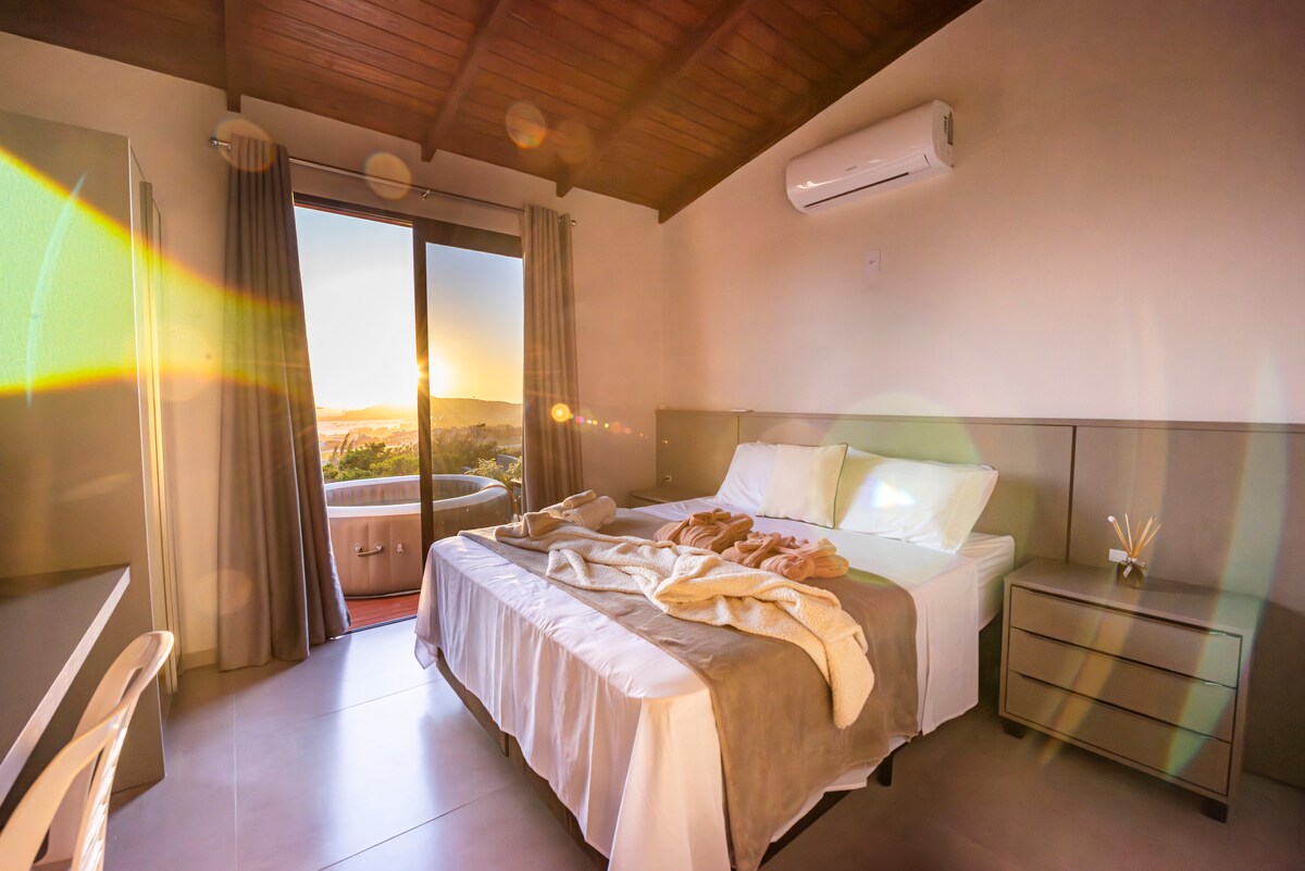 Bungalov Sol, nalazi se na plaži Ribanceira, visoko na brdu sa privilegovanim pogledom na more. Predivno! Mirno i prijatno okruženje usred prirode sa potpunom privatnošću i bezbednošću. Idealno za parove i porodicu sa do dvoje dece. Otkrijte naš novi prostor koji nudi terasu sa SPA CENTROM i svim neophodnim aparatima i posuđem, klimatizovanim okruženjem, vodu sa grejanjem na gas, prenosivim američkim roštiljem i Wi-Fi mrežom od 500 mb.