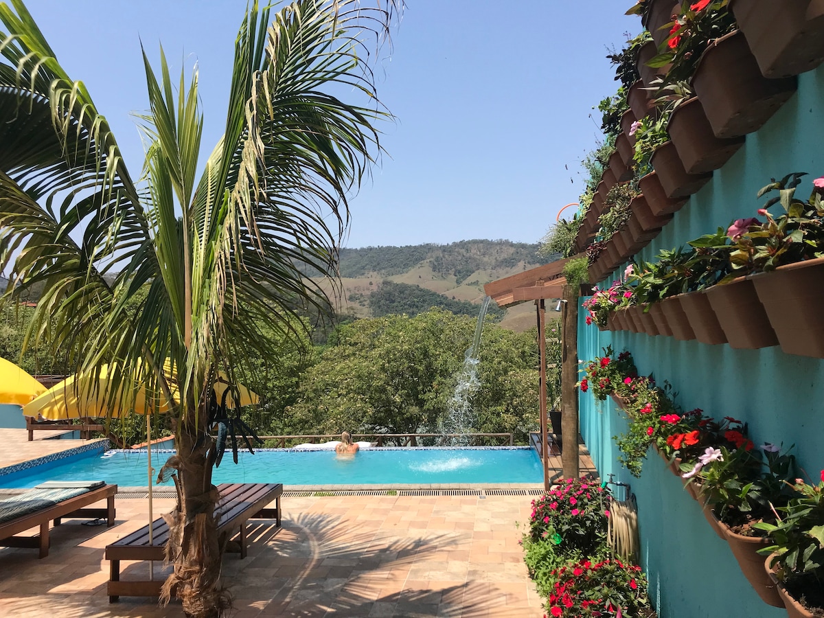 Dođite i uživajte u jedinstvenom iskustvu među planinama i skrivenim vodopadima. Lokacija na granici Minas Žeraisa, Rio de Žaneira i Sao Paula, u podnožju planinskog lanca Mantikera i Nacionalnog parka Itačaja. Velika i udobna kuća, prijatni apartmani, opuštajuća sauna i fudbalski teren. Savršeno utočište za one koji traže mir i avanturu. Uživajte na našoj terasi dok posmatrate mesec ili se opuštate pored kamina. Kuvajte sa porodicom i prijateljima na našem šporetu na drva. Jahanje konja, roštilj, „acqua trekking“ i još mnogo toga!!!
