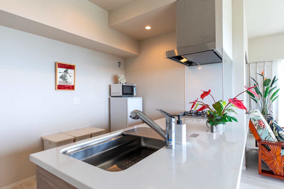 A 66 square meter condo with a panoramic ocean view. Can walk or take sightseeing cars to Aquarium and further to Emerald Beach through the park. 30-sec walk to a mall with Starbucks, etc., 3-min walk to the bus stop from Airport. 5-min walk to a Family Mart. 1km to a local beach. (Even shorter, if you use a short-cut) *We no longer provide seasonings. *The black color or th etiles in the bathroom is not a mold, but the joints of the tiles.