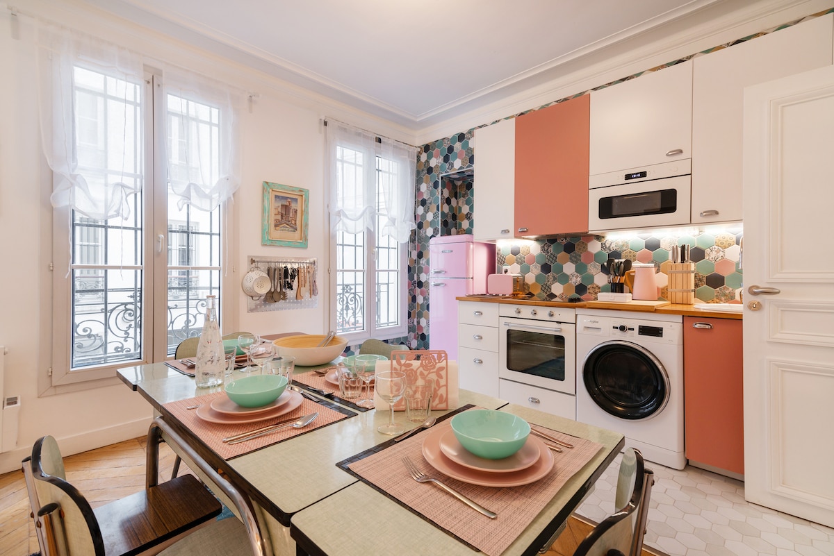 Book with confidence: cancellation conditions are eased from April 1 to April 30, with a full refund up to 5 days before arrival Steps from Place de la République in central Paris, this charming and quiet 3-room apartment features bohemian décor. 2 bedrooms (1 bed 160×200 and two beds 90×200), living room with sofa bed (140×190), open kitchen with dining area, and 2 bathrooms with toilets. Mobile air conditioning. Ideal for up to 6 adults. Luggage drop-off from 11:30 AM, check-in from 3 PM.