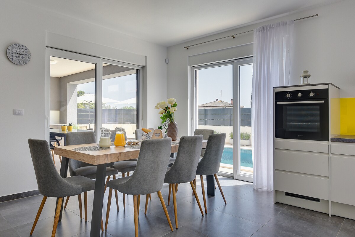 Potpuno nova gradska vila sa bazenom dizajnirana za maksimalnu udobnost i zadovoljstvo. Lokacija vile je savršena kombinacija spokoja ruralnog područja i blizine centra 3000 godina starog grada Pule. Kuća može da primi 6-8 ljudi i sastoji se od prizemlja sa kuhinjom i trpezarijom sa direktnim pristupom spoljnoj terasi i bazenu,dnevnom boravku i kupatilu, kao i gornjem spratu sa 3 spavaće sobe svaka sa svojim kupatilom.