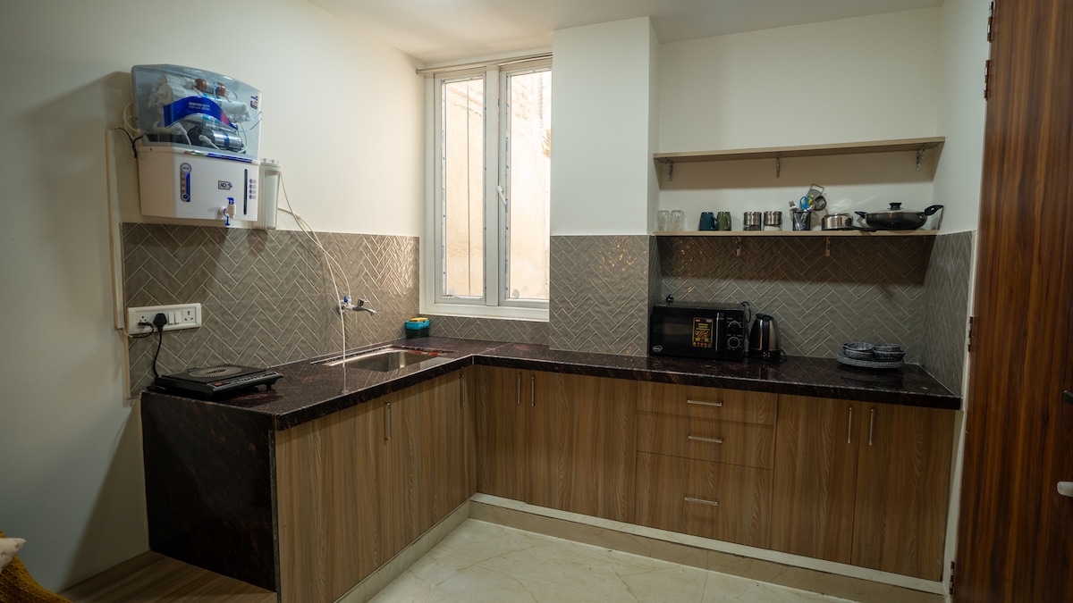 Smješten u srcu Džaipura u šarmantnoj rezidencijalnoj četvrti Bani parka, stan nudi spoj udobnosti i stila. Uživajte u luksuznim sadržajima kao što su pametni TV, potpuno opremljena kuhinja, čista posteljina, brzi internet i kućni veš sa opremom za peglanje. Prigušeni tonovi, meke nijanse i ručno otisnuti cvjetni motivi inspirisani ružičastim gradom stvaraju toplu atmosferu spremnu za odmor, što ga čini savršenim domom daleko od doma tokom vaše posjete Džajpuru.