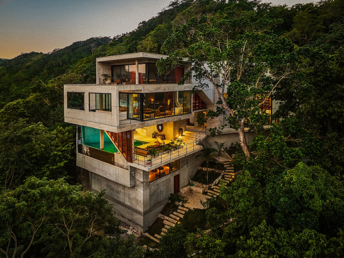 Modern tropical treehouse near Half Moon Beach Open the wooden gates to a palm-lined allée leading to tropical modernism above the sea. A terrace and balconies lined with loungers all face the heated pool with a diving board, and the fitness room opens to a treetop deck for yoga. Settle in for a massage while the chef and butler work the scene, and feel the ocean breeze on a chevron-patterned armchair by the TV. Half Moon is a 2-minute drive. Copyright © Luxury Retreats. All rights reserved.