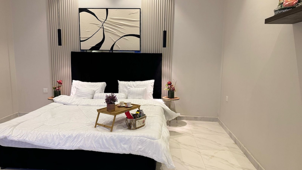 Šarmantan, savremeni apartman na plaži u srcu Obhura. Samo nekoliko blokova dalje od neverovatnih odmarališta na plaži, restorana, BBQ-a, kafića, barova, pivara i još mnogo toga. Savršeno za vikend odmor, poslovno putovanje, odmor, alternativu za rad od kuće ili udobnu kućnu bazu dok istražujete sve što Jeddah ima da ponudi. Nepobjediva lokacija sa pogledom na more, stadion Aljawhra, tržni centri i mnogi drugi koji su udaljeni samo nekoliko minuta. Aerodrom je udaljen 15 minuta.