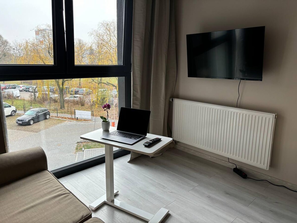Odsjednite u svijetlom studio apartmanu u Ratajachu! Sa brzim Wi-Fi mrežom (optički kabl) i potpuno opremljenom kuhinjom. Kupatilo sa kadom. Da biste stigli do Starog trga, samo uđite u autobus ispred zgrade. Mirno i lepo okruženje sa sjajnim igralištem. Besplatna parking mesta ispod zgrade. Savršeno mesto za vikend u Poznanju, duži boravak ili kućnu kancelariju.