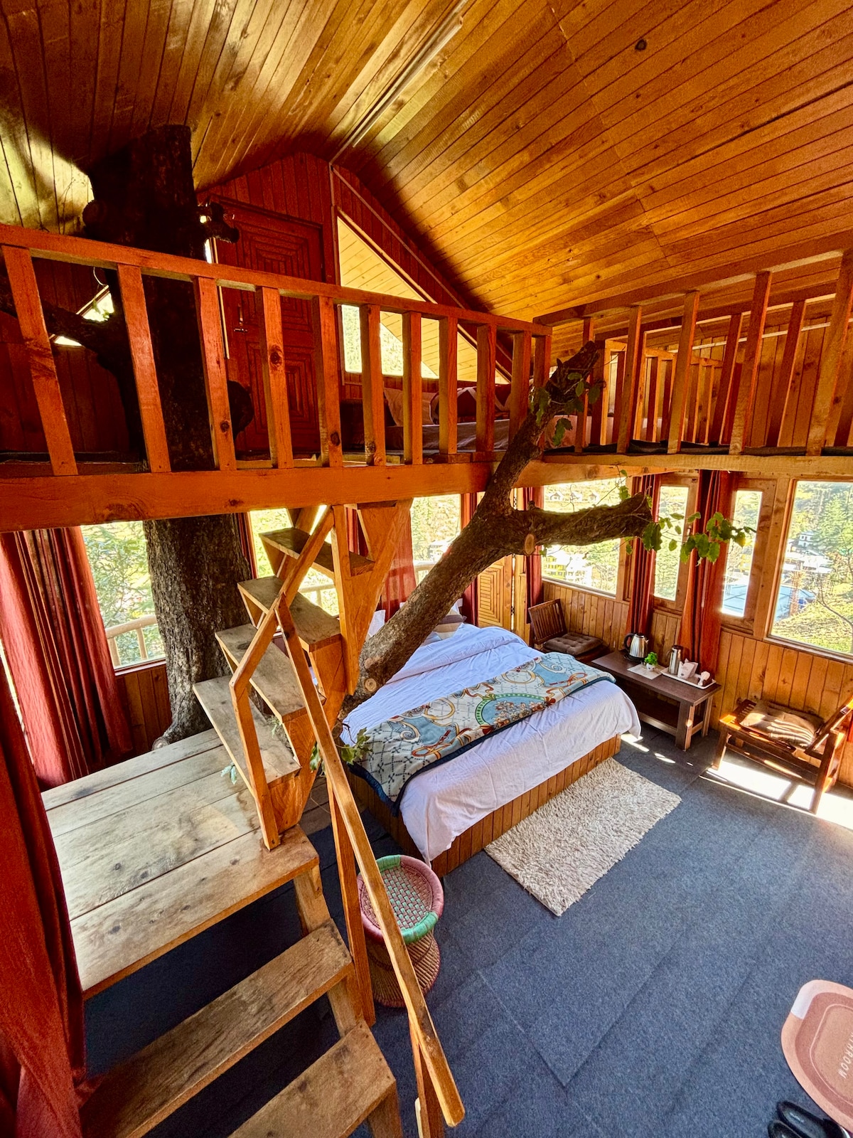 You'll love this unique and romantic escape in Jibhi Valley. Our Spacious and Lavish treehouse offers comfort of modern amenities and joy of nature. ★ Wooden & Glass Architecture ★ Panoramic view ★ Scenic Location ★ Wi-Fi ★ Power Backup ★ Food service ★ Bonfire area ★ Parking at property Please note, Breakfast, Room heaters, Bonfire & other services are exclusive of stay price.