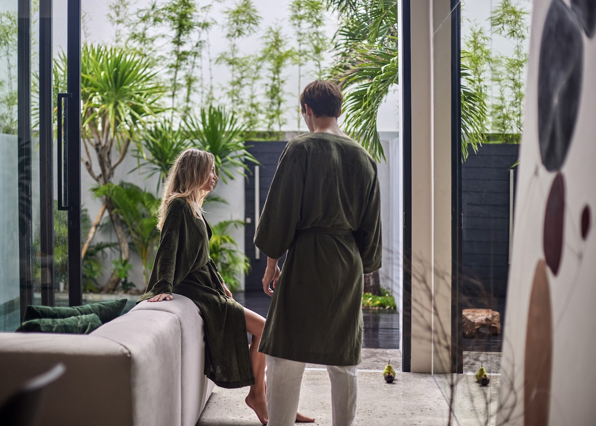 Dobro došli u Casaluna, vašu modernu tropsku kuću za odmor na Baliju u Čangguu! Naša privatna Airbnb kuća u nizu kombinuje moderan industrijski stil kuće u nizu s prirodnim tropskim elementima, stvarajući prekrasan i estetski prijatan prostor za vaš odmor. Unutra ćete pronaći dobro opremljenu kuhinju, trpezariju na otvorenom i prostor za opuštanje. Spavaća soba sa zasebnom kupaonicom je prozračna i uredna, sa dizajnom i zemljanim tonovima koji izazivaju osjećaj topline i udobnosti.