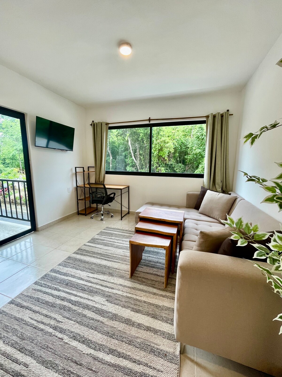 Doživećete udobnost i spokoj u našem prostranom i udobnom APARTMANU ALUNA. Uživajte u opremljenoj kuhinji, bračnom krevetu, Smart TV-u, Wi-Fi mreži od 500 Mbps i terasi sa privatnim đakuzijem sa pogledom na prirodu. Odmorite se u ovom mirnom okruženju, u sklopu kompleksa KUĆA U DŽUNGLI, koji se nalazi u privatnom dijelu iznad 38. ulice, samo 2 bloka od Pete avenije, plaže, restorana i supermarketa.