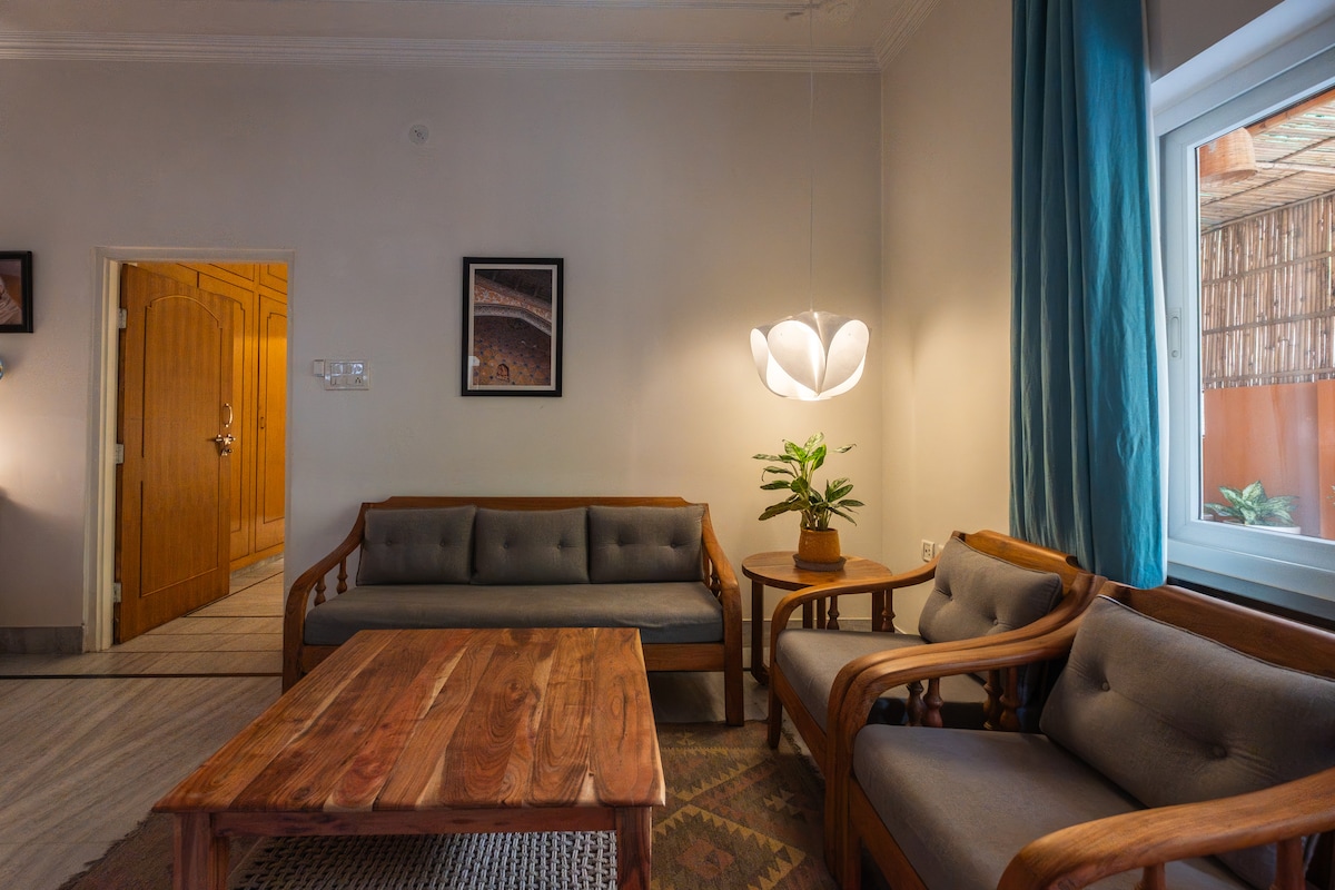 Dobro došli u Terracopper - naš mirni dom u Džajpuru bogat atmosferom. Bijela tematika, tamjan s mirisom Jaipurija i opuštenim meditativnim osjećajem. Privatni apartman na 1. spratu u blizini JKK-a i Central parka. Suncem osvijetljen, prozračan, prostran, sa ljuljaškom, zonom za jogu, kućnim bioskopom, čajnom kuhinjom i kabinom za snimanje. Odlično za samostalne boravke, umjetničke rezidencije, projekcije. 80% bez plastike. Prikladno za porodice. Fleksibilna prijava. Zabranjeno je pušenje, alkohol u zatvorenom prostoru. Samo čista tišina i dobra energija. Slobodan protok u praznom prostoru.