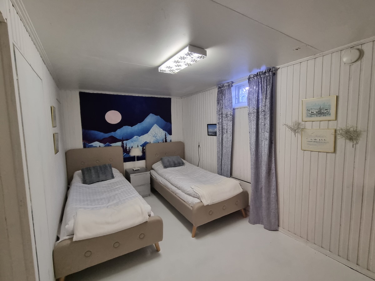 Prostrani dvosobni stan u centru Kirune. Stan se nalazi na donjem spratu i ima zaseban ulaz. Tu je velika kuhinja sa najosnovnijim kuhinjskim potrepštinama, dnevnom sobom, spavaćom sobom i kupatilom. Stan je pogodan za 4-5 osoba. Postoji veliko dvorište i u hladnim, čistim noćima odatle je moguće videti severnu svetlost. Centar grada je udaljen sedam minuta hoda od stana. Svetski poznati Icehotel udaljen je samo 15 minuta vožnje.