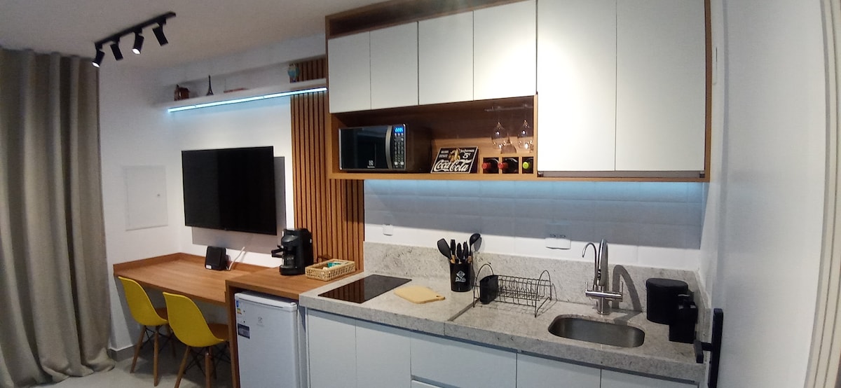 Izuzetno udoban studio apartman sa nenadmašnom lokacijom za vaše poslovne i/ili slobodne obaveze. ► Bračni krevet sa dušekom sa oprugama; ► Smart TV 40” (uključujući Netflix, Prime Video, Disney+ i Globoplay); ► Klima-uređaj; Turbo ► ventilator; Roletne ► za zamračivanje; ► Ormar sa vješalicama; Bluetooth zvučna► kutija; ► Sto za učenje/rad sa lampom; ► Kauč na razvlačenje; ► Sto za hranu; ► Opremljena kuhinja za pripremu manjih obroka.