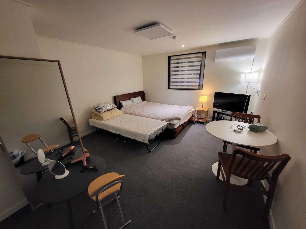 * 5 minuta hoda od glavne prodavnice katedrale Svetog srca, * 2 minuta hoda od stanice Jungangno, * 10 minuta hoda od stanice Daejeon, 9 minuta automobilom od bejzbol stadiona Hanwha Postoji bračni krevet (160x200) i krevet za jednu osobu za ugodan i udoban odmor za najviše 3 osobe, a opremljen je ormarom, stolom, stolicom, frižiderom i ogledalom. U kupatilu nakon olimodelinga obezbjeđujemo šampon, tretman, gel za tuširanje, pastu za zube i toalet papir. Zajednička kuhinja ima veliku mašinu za pranje veša, mašinu za sušenje veša, prečišćivač vode, indukcioni i pribor za kuvanje, tako da je veoma pogodna za dugoročne boravke. Dozvoljeno je parkiranje.