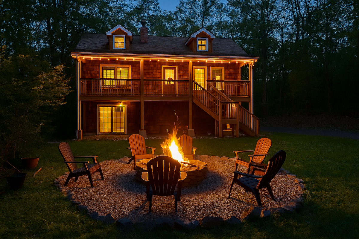 Moderni bungalov uz rijeku u skandinavskom stilu na 8 hektara. Sjedite na terasi sa svjetlucavim svjetlima za kafu/večeru ispunjenu zvukovima i pogledom na užurbanu rijeku; prošetajte preko rijeke u svoje privatno mjesto za plivanje! Savršeno mjesto za odmor u prirodi, planinarenje, plivanje, ribolov (opskrbljen svakog aprila), skijanje, rad s pogledom na planine ili pisanje romana koji ste oduvijek željeli da završite. 2 sata od mosta Džordža Vašingtona. Punjač za električna vozila 2. nivoa. Mržnja ovde nema doma - sve je dobrodošlo.