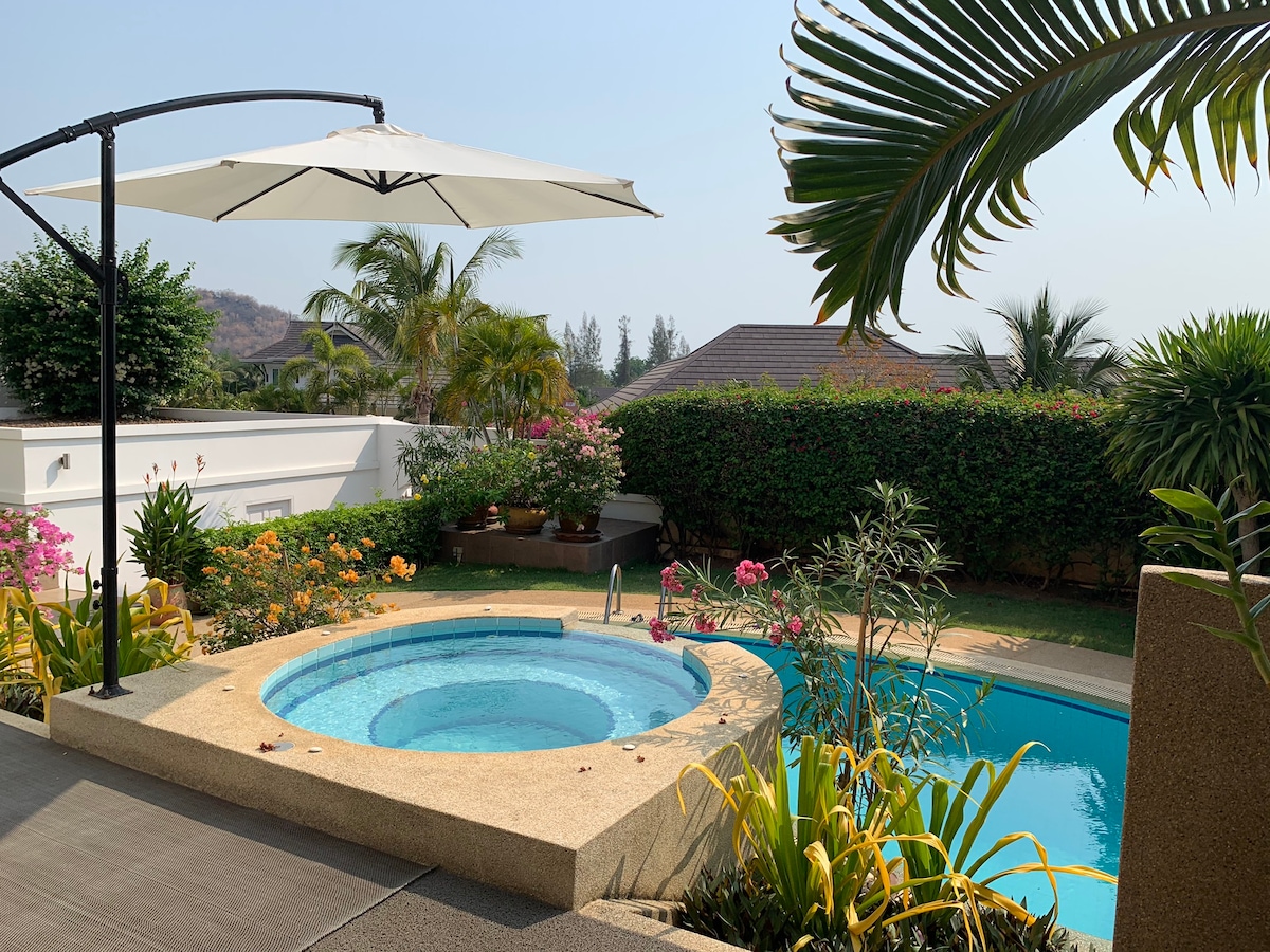 Novi, romantičan, udoban, čist i bezbedan dom, prikladan za porodice i kancelarije. Veliki đakuzi za 6 ljudi!! Vrlo praktičan, kompletan klima-uređaj, dobri dušeci, nekoliko sjenovitih terasa, moguć roštilj, mašina za pranje veša, topla voda, Netflix ... Nalazi se u opuštajućem i mirnom selu, samo 5 do 10 minuta od ... - centar grada - prelepe plaže - tržni centri - turističke atrakcije - bolnice Takođe pogledajte naše druge kuće za odmor sa 5 zvezdica: airbnb.com/h/huahincityloft ... i: airbnb.com/h/city88home