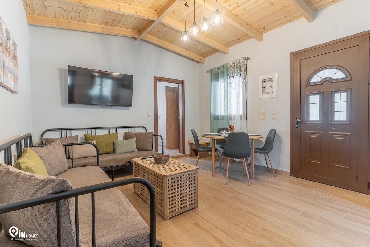 Potkrovlje - Zapanjujući, potpuno novi stan s pogledom na planine, savršeno spaja autentični rustikalni šarm sa modernom udobnošću. Smješten na gornjem spratu samostojeće kuće, ovaj stan u potkrovlju ima otvoreni salon/trpezariju, izložene drvene grede i prekrasan kameni kamin, stvarajući prijatan ambijent na selu za nezaboravan boravak. Samo 7 minuta hoda do glavne glavne ulice sela Pramanta sa kafićima, tavernama, prodavnicama i pekarom - idealno za odmor bez automobila.