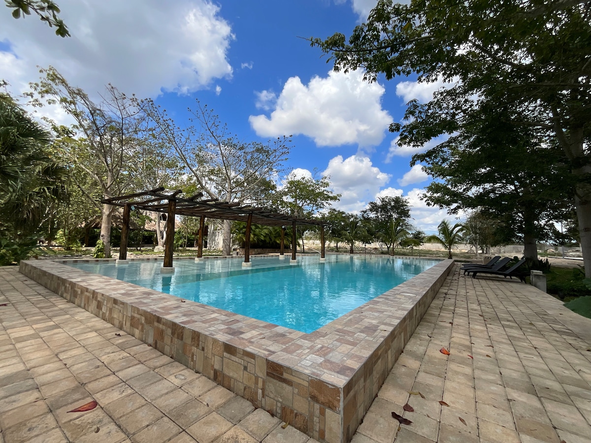 Priroda, stil i spokoj su vam na raspolaganju u ovoj prostranoj, svetlom ispunjenoj gostinjskoj kući i studiju za pisanje. Idealno za one koji traže miran odmor sa jednostavnim pristupom gradu ili plaži. Merida je udaljena 20 minuta u jednom smjeru, a plaža je udaljena 20 minuta u drugom. Uživajte u pjevanju ptica, zvjezdanim noćima i prelijepim tropskim vrtovima s jezercem koi, fontanama i džunglom poput tropskog vrta. Uživajte u opuštajućem doživljaju nalik spa centru uz infracrvenu saunu za 4 osobe sa terapijom crvenim svetlom.