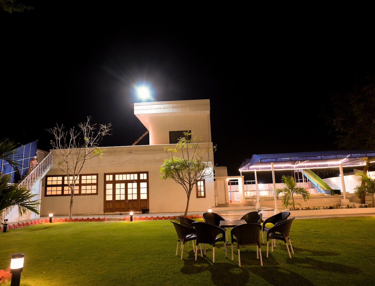 Located only 5 minutes from Malir Cantt and 10 minutes from Scheme 33, An ideal escape for families looking for comfort, fun, and relaxation without traveling far. Packed with entertainment for all ages. Enjoy two swimming pools – adults and kids – along with a variety of indoor games. Lush green lawn and exotic birds. Luxurious rooms, a media wall with Netflix, and a fully equipped American-style kitchen with modern facilities, making it perfect for family gatherings or small group getaways.