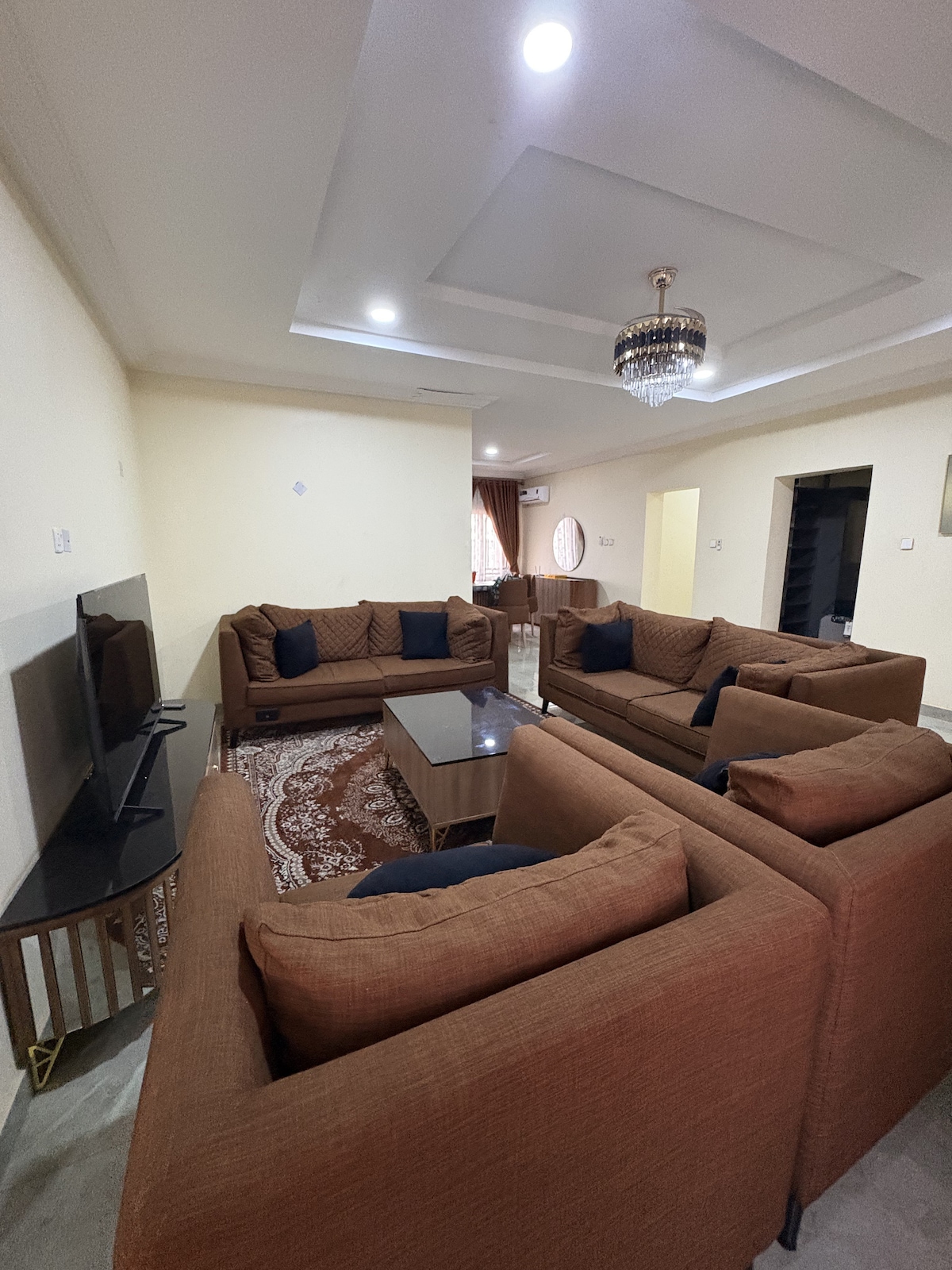 Elegantan dvosoban stan sa 65-inčnim pametnim TV-om, Netflix-om, besplatnim Wi-Fi-jem i mini vinskim barom. Uživajte u dve udobne spavaće sobe, čajnoj kuhinji sa mikrotalasnom pećnicom, frižideru, šporetu na plin i mašini za pranje veša od 9 kg. Nalazi se u bezbednom naselju Gaduva, na samo nekoliko minuta od tržnog centra Gaduva, prodavnica i kafića. Savršen za poslovne ili slobodne boravke, ovaj udoban dom kombinuje udobnost, praktičnost i mirno okruženje za opuštajuće iskustvo u Abudži. Radujemo se što ćemo vas ugostiti. 😊