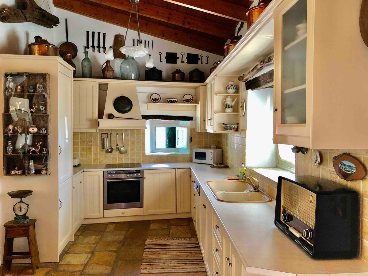 Opustite se na brdskoj terasi sa pogledom na more dok osvježavajući morski povjetarac teče cijeli dan. U večernjim satima vazduh nosi miris jasmin i honeysuckle-a. Umirujuća atmosfera se nastavlja u zatvorenom prostoru sa biljkama u saksijama, elegantnim ugrađenim nameštajem i ukusnim dekorom u prigušenim zemljanim tonovima. Osvjetljenje i drugi detalji upotpunjuju spokoj. Kuća ima prozračnu opuštenu atmosferu, kombinujući modernu arhitekturu sa tradicionalnim elementima. Možete da uživate u visokokvalitetnim materijalima, visokim plafonima, razigranom svetlu i finoj posteljini. Bluetooth zvučnik je dostupan za uživanje u omiljenoj muzici sa računara. Spavaće sobe imaju kupatila spojena sa sobom. Obezbeđena je potpuno opremljena kuhinja sa mašinom za sudove i aparatom za kafu espreso. Na raspolaganju je izgrađeni kameni roštilj. U hladnijim mesecima tu je šporet na pelet sa električnim ćebadima koji mu daju topao osećaj. Imate pristup našoj bašti sa povrćem koja se uzgaja u skladu sa godišnjim dobima, naravno. Na raspolaganju sam u svakom trenutku za svu potrebnu pomoć. Iako je ostrvo Itaki malo, ima mnogo skrivenih blaga. Zadovoljstvo mi je da vam pomognem da ih istražite. Sve usluge vezane za odmor, kao što su iznajmljivanje ili rezervacije, mogu se ugovoriti na zahtev. Ostrvo Itaki je prilično intimno mesto sa mnoštvom blaga koje treba otkriti. Kuća se nalazi u selu Ag. Saranta, tradicionalno naselje u sjevernom dijelu, s pogledom na zaliv Afales. Plaža u blizini sa neverovatnom vodom udaljena je 5 minuta vožnje. Selo Stavros, sa svim sadržajima, i ribarsko selo Friks udaljeni su 1,5 kilometar. Nažalost, nema javnog prevoza u Itaki. Iznajmljivanje automobila je veoma preporučljivo Pristup Ithakiju moguć je i putem Cephalonia, Patra, Astakos, a u ljetnim mjesecima i od Lefkasa.