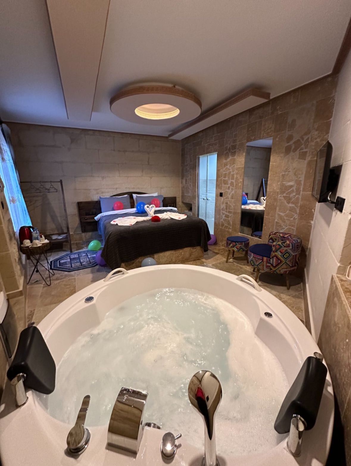 Kapadokya’da 53 m²’lik King Pool Room’da doğal taş ve kemerli tavanların mistik atmosferinde konaklayın. Özel siyah su havuzu, odun sobası, yerden ısıtma, XXL yatak, çift duş, çift lavabo ve balkon ile modern konforu yaşayın. Kişisel bakım seti ve lüks detaylarla unutulmaz bir mağara deneyimi sizi bekliyor.