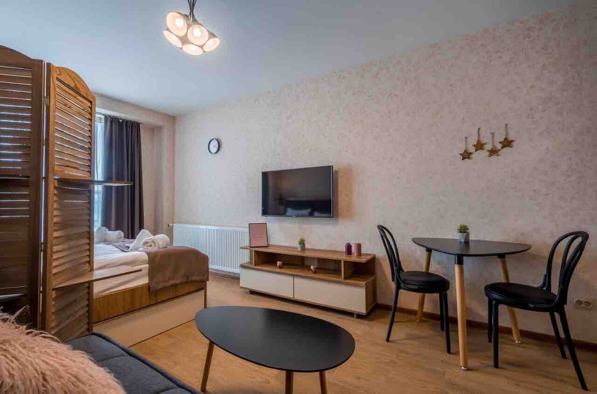 Osećajte se kao kod kuće u našem novom dvosobnom stanu u Kazbegiju. Stan se sastoji od 2 velike svetle spavaće sobe sa udobnim bračnim krevetima i potpuno opremljenom kuhinjom.