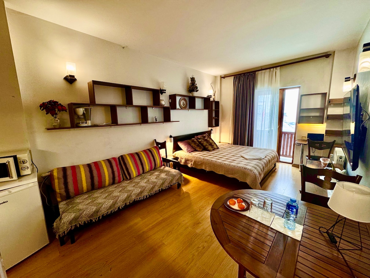 Welcome to our cozy 36 square meter studio apartment in the Atrium Building, New Gudauri. This charming space features a comfortable queen-size bed, a well-equipped kitchen, a shower and toilet, and a stylish salon area. Enjoy breathtaking views from the balcony, overlooking the ski slopes and majestic mountains. Perfect for a relaxing and memorable stay in the heart of Gudauri. View from the balcony over the town Pool+Restaurant aren’t working till December 2025 ✔ Ski Depot