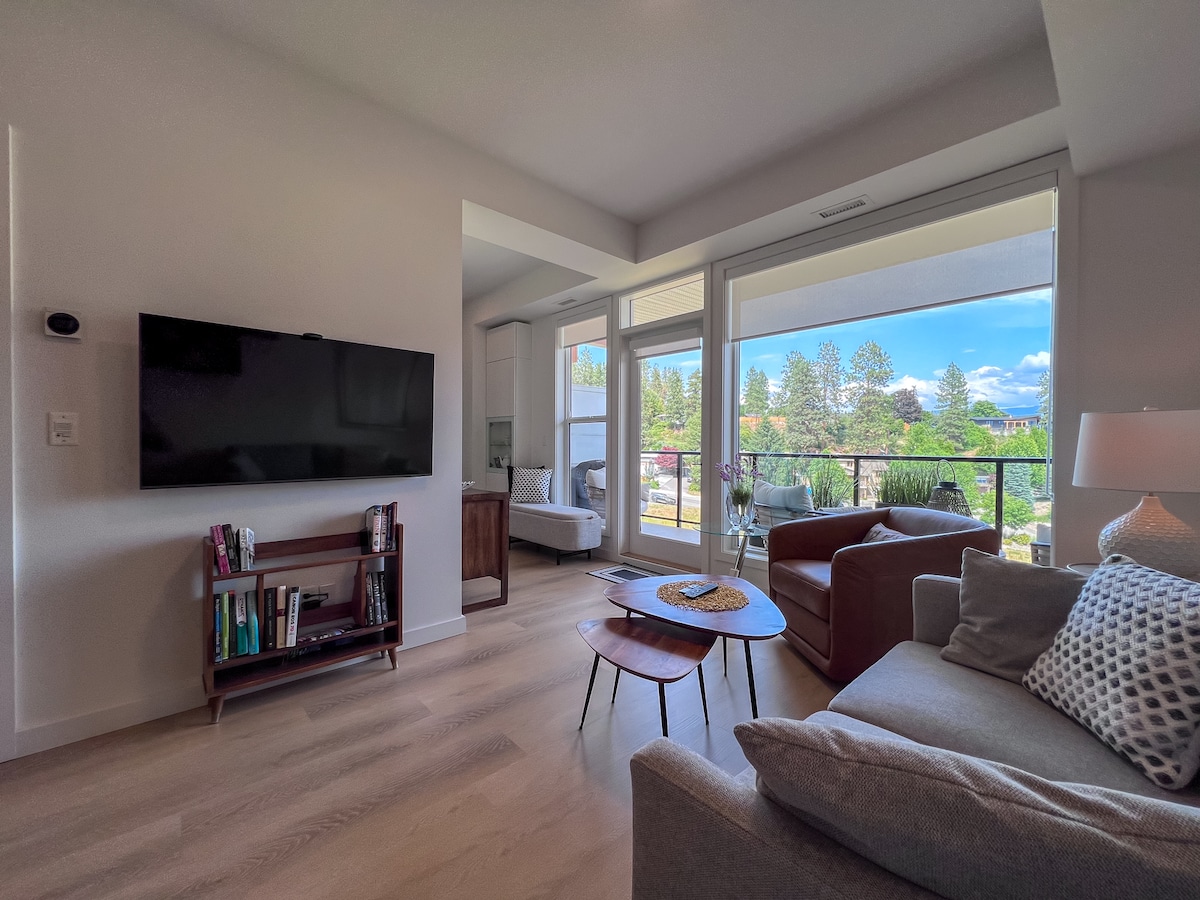 Opustite se i uživajte u pogledu iz ovog jednosobnog apartmana sa privatnom digitalnom bravom. Vrlo veliki vanjski prostor s mnogo mjesta za sjedenje. Potpuno opremljena kuhinja, uključujući šporet/rernu, frižider u punoj veličini i mašinu za sudove. Aparat za kafu, čajnik, toster itd. Bračni krevet (širine 180-220 cm) u spavaćoj sobi sa VIC/ vešom za vašu udobnost. Predivan pogled na Kelovnu danju i noću. Pored parka, planinarenja, plaža i 5 minuta do šopinga i restorana u centru grada. Postoji mnogo vinarija udaljenih samo 10 minuta vožnje.