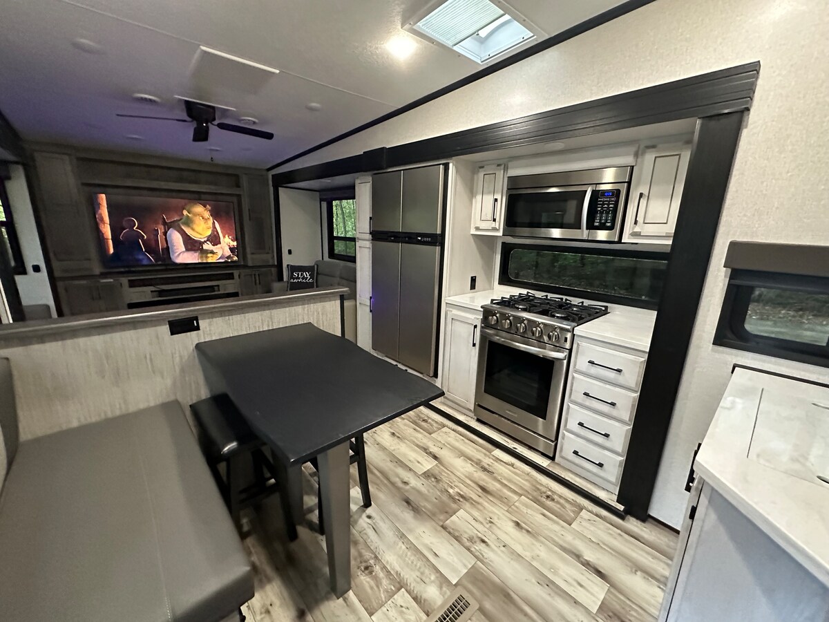 Frannie is a modern, minimalist camper in the Outpost Campground, just 3 miles from Cave Run Lake and a little over 48 miles from Red River Gorge. Uživajte u prostranom enterijeru, natkrivenom trijemu s namještajem, visećom ležaljkom, terasom za roštilj i ognjištem. Uživajte u pristupu svim sadržajima kampa, uključujući bazen, teren za pikbol, igralište, košarkaški teren i povremeni kamion sa hranom. Sa namjenskim parking mjestom i jednostavnim pristupom prirodi, Feni je savršeno mjesto za opuštanje nakon dana avanture!