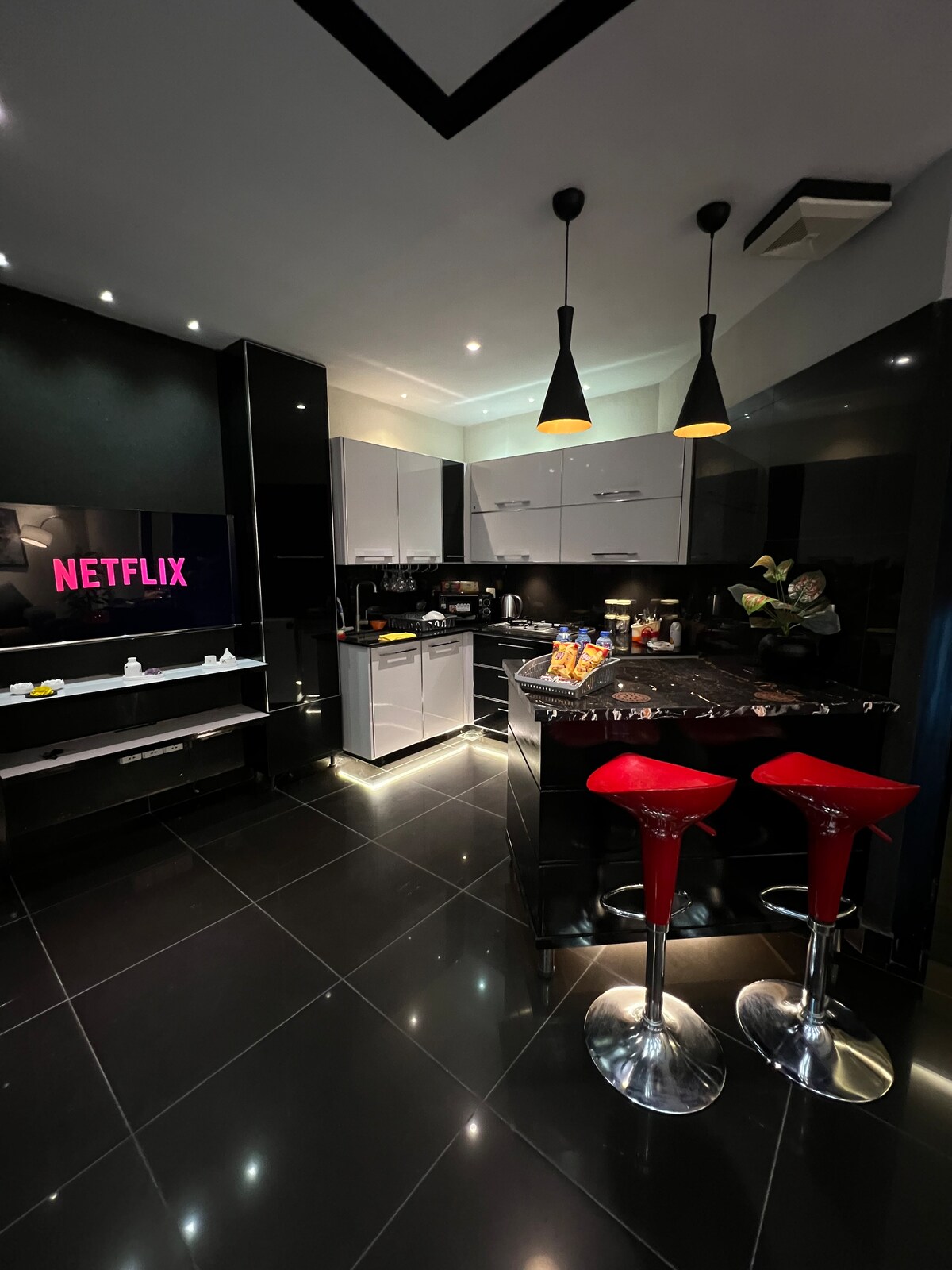 Pobegnite u MMUK-ov luksuzni apartman 2BHK, moderan i udoban smeštaj na samo 4 minuta od D-12. Uživajte u privatnom prizemlju sa elegantnim enterijerom, 55-inčnim pametnim TV-om sa Netflix-om i Prime-om, brzim Wi-Fi mrežom i namenskom sobom za bilijar za zabavu. Savršeno za porodice, parove i poslovne putnike koji traže udobnost i stil. Blizu D-12 Markaza, brda Margala, džamije Fajsal, prodavnica i kafića.