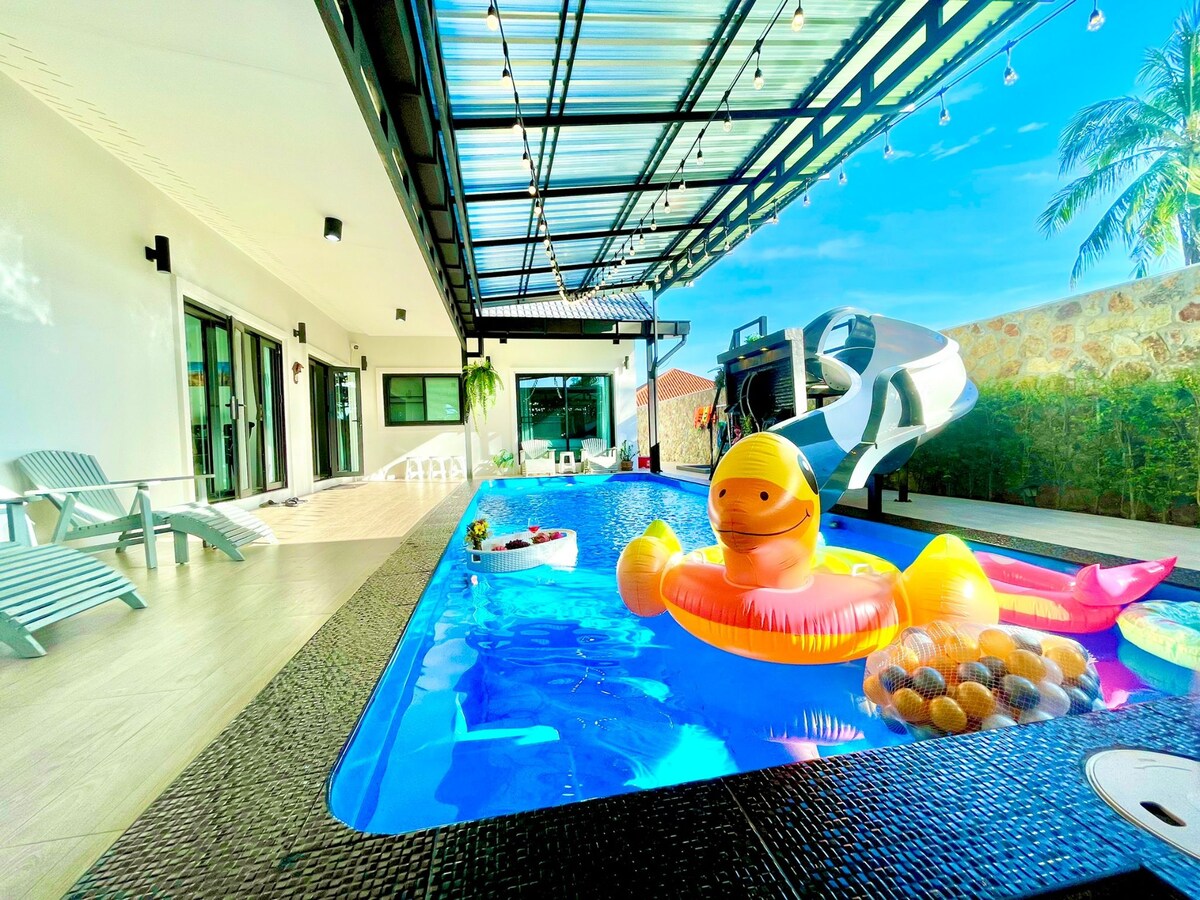 🌴 Your private pool villa getaway, near Siam Country Club.🏌♀️ -3 bedrooms 3 bathrooms (2 King, 2 Twin) -Utilities included -Private Pool -Pool cleaning (2x a week) -WIFI (Hi speed) -Smart TVs (living 65"/master 55") -Board Games & Karaoke -BBQ grill -Equipped Kitchen -Blackout curtains -Washer/Dryer -Fresh Towels -Shampoo/Conditioner/Soap -25 min. drive to Jomtien Beach ❤️ Perfect for family vacation, nature-lovers, quiet nights, & longer stay. ⭐️SPECIAL weekly & monthly price Book now❗️
