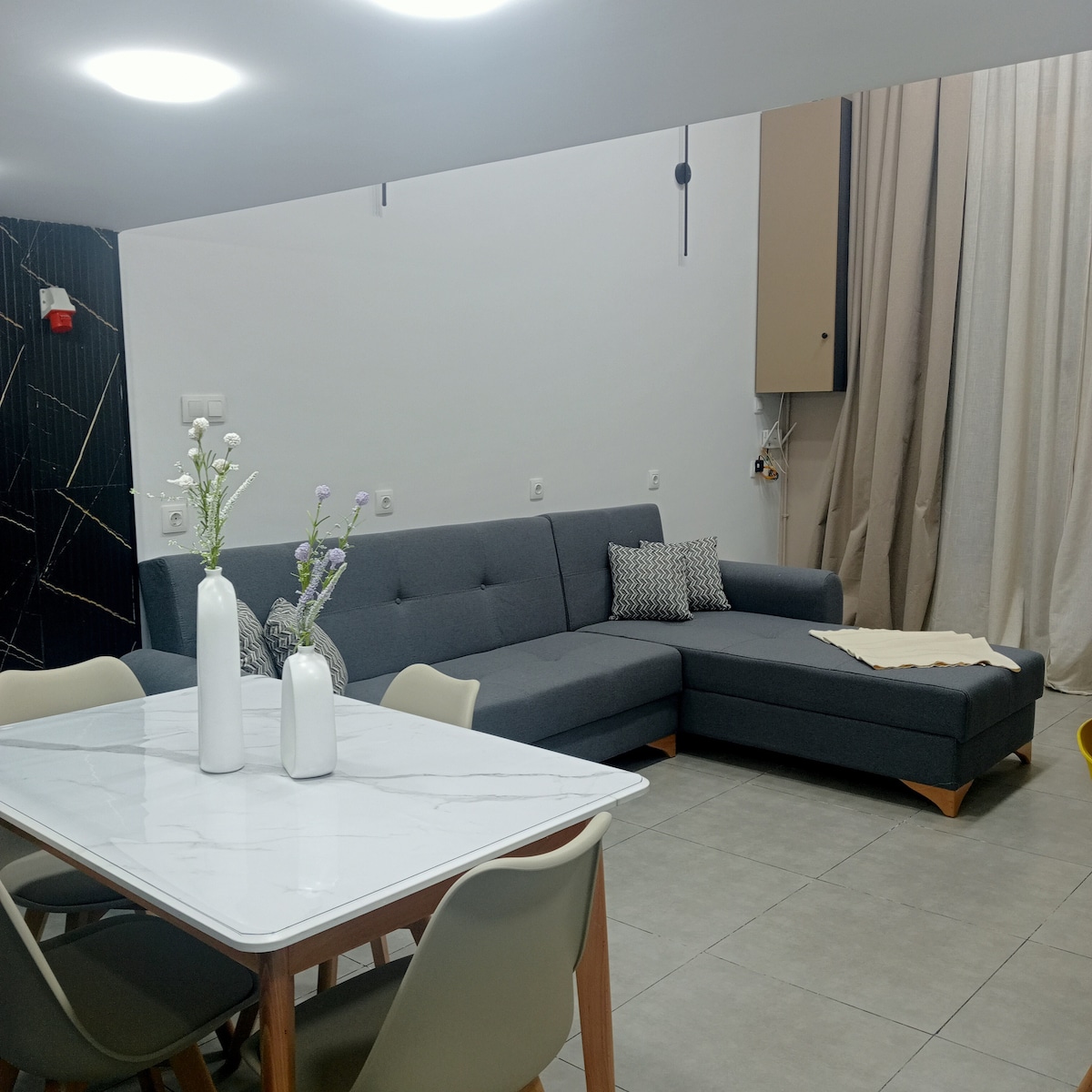 Iznajmljivanje novog stana na prvom spratu od 90 m2 sa spavaćom sobom, velikim dnevnim boravkom otvorenim prema kuhinji, sa svom potrebnom opremom, toplom i hladnom vodom 24 sata dnevno, kupatilom, kuhinjom opremljenom frižiderom od 440 l, mašinom za pranje veša marke 10 kg, stanom može da primi par u spavaćoj sobi i tri osobe u marokanskom dnevnom boravku od 30 m2 sa prenosnim TV-om od 55 cm, besplatnim parkingom.