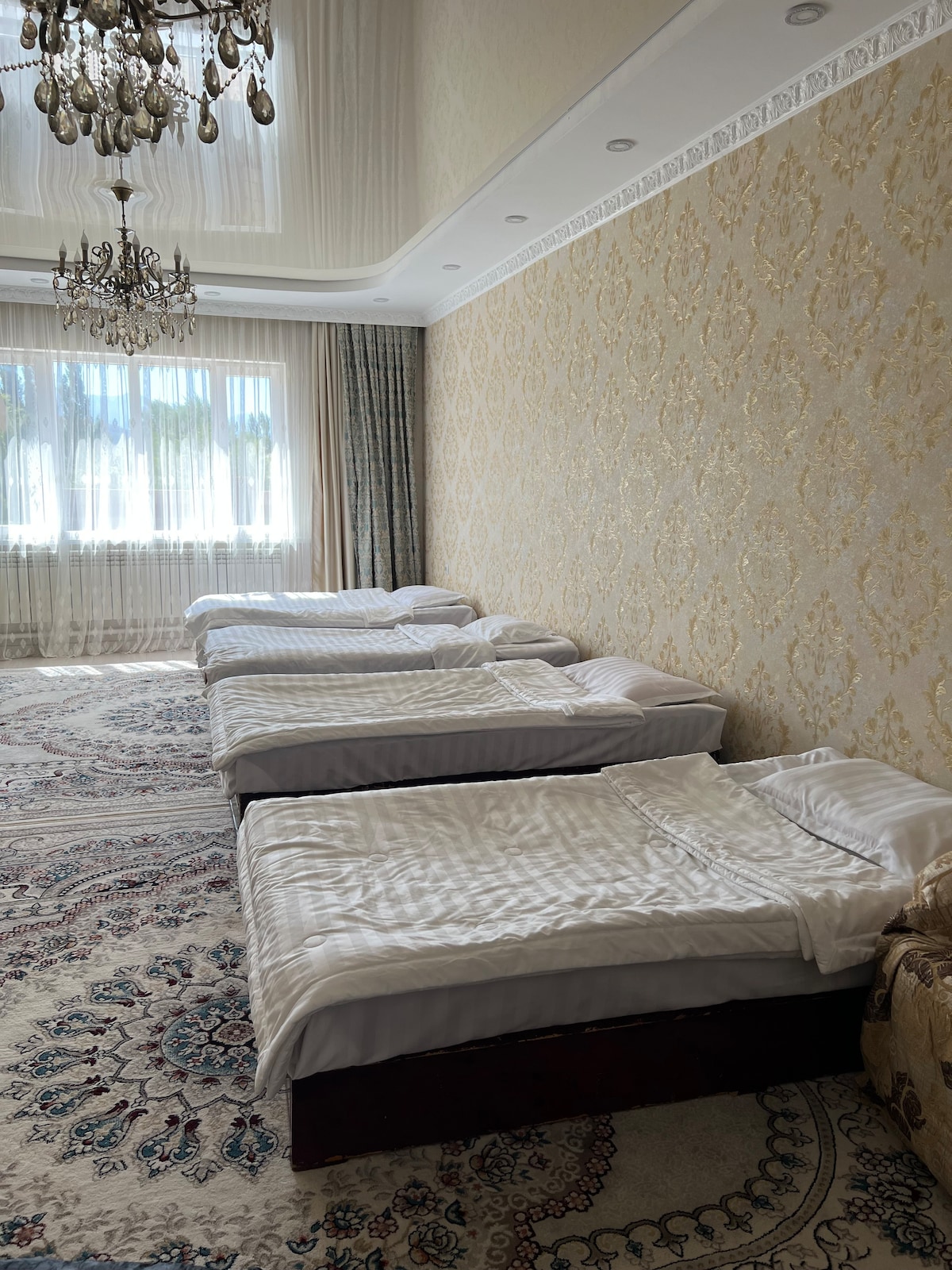 NOVA gostinjska kuća u etničkom stilu, kristalno čist vazduh i nevjerovatna atmosfera - savršeno utočište u Kirgistanu! Eko kuća. Na prvom spratu se nalazi veliki dnevni boravak u kojem se možete opustiti i kuhinja sa svim pogodnostima i uređajima. Na drugom spratu se nalaze 3 spavaće sobe, svaka sa 3 kreveta. Svaka spavaća soba u gostinjskoj kući ima WC šolju, umivaonik i tuš-kabinu. Bavimo se poljoprivredom. Postoji prelijepa bašta sa 4 platforme pored rijeke i 5 visećih ležaljki.