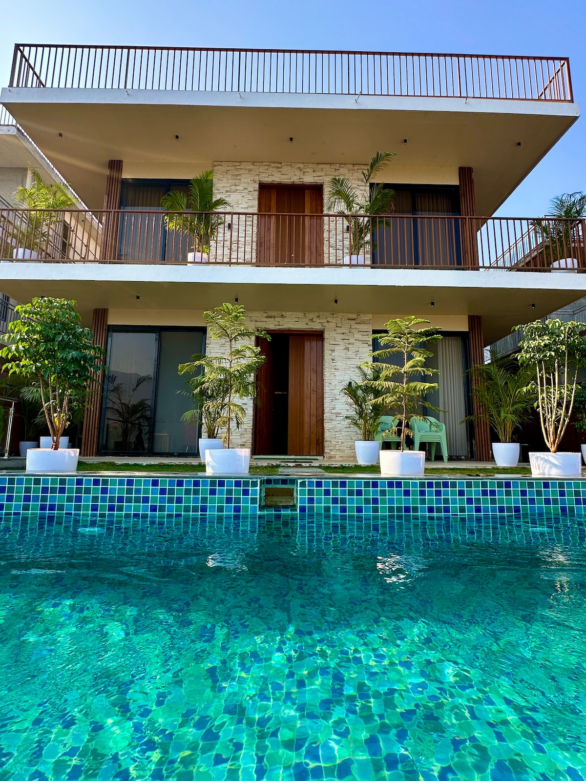 'Villa Elsewhere' is a luxurious, beautiful, private pool villa, just 60-90 mins drive from Mumbai. Surrounded by lush green views of fields, hills, and sounds of nature. The Villa has 3 AC en-suite bedrooms, a large AC living room that opens into a private pool and large deck with a Bar. The kitchen is fully equipped where a chef can make delicious meals (*extra charge). It is pet friendly (*extra fee). BOOK to relax in a calm peaceful vibe, for a get together, or to host the best part ever!