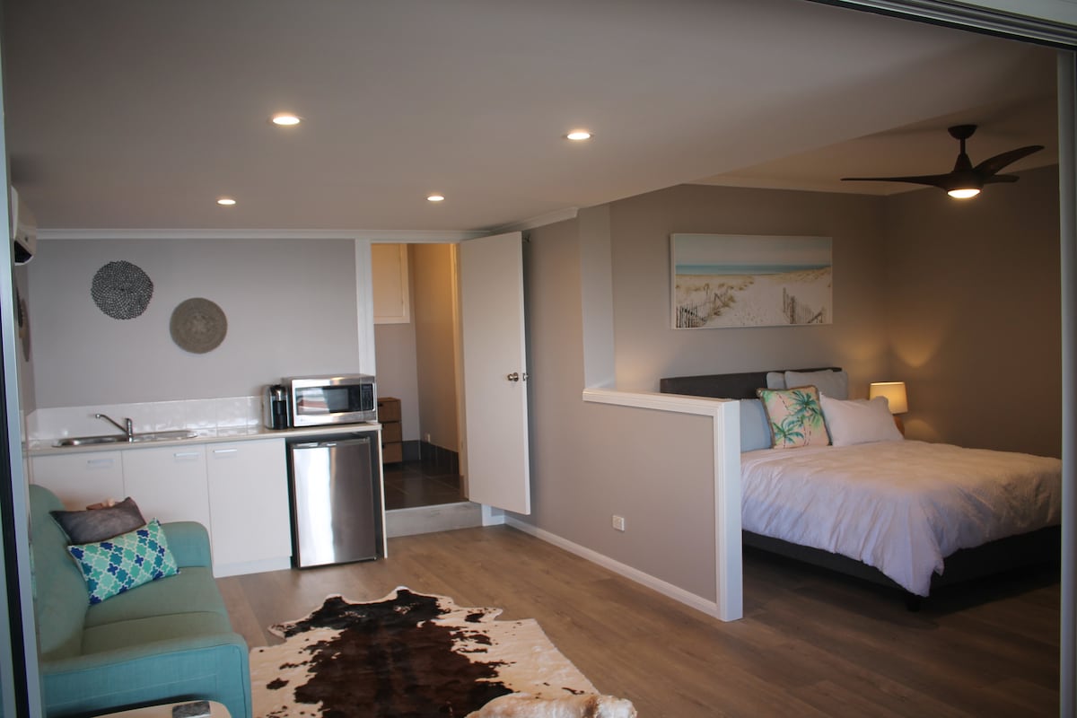 Ovaj studio sa pogledom na more gleda na Tvid River i plaže Kingscliff. Probudite se i uživajte u kafi i doručku dok sedite unutra ili napolju na jutarnjem suncu. Centralno se nalazi samo 2 minuta od autoputa M1 Pacific i 5 minuta do nekih od najboljih plaža na svijetu. Mnogo prodavnica, pabova i klubova u blizini i udaljen manje od 10 minuta od aerodroma Gold Koust. Ovaj luksuzni privatni studio je nedavno renoviran i neće vas razočarati.