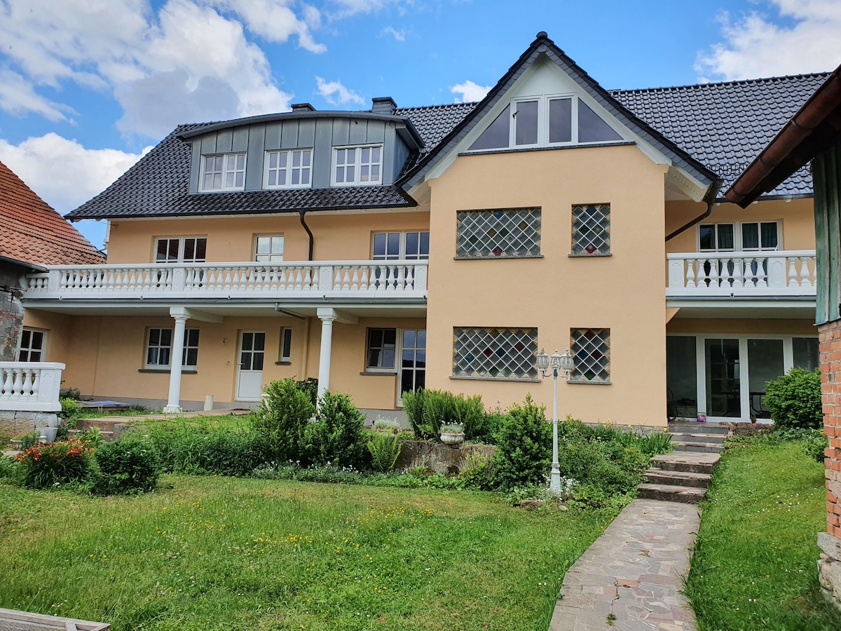 Willkommen! Unser ehemaliges Bauernhaus, dessen Grundsteine in das 18. Jh. zurückreichen, liegt mit seinem großen Hof mitten im Grünen. Ein Bach fließt gleich hinterm Haus durch ein Naturschutzgebiet und die hügelige Landschaft mit Wiesen und Wäldern lädt zu Wanderungen mit immer neuen Ausblicken ein. Die sonnige Wohnung selbst, mit alten Dielen und Schätzen aus 3 Generationen, ist ideal für Familien oder Freunde und alle, die, ob zum Entspannen oder Arbeiten, Ruhe und Natur suchen.