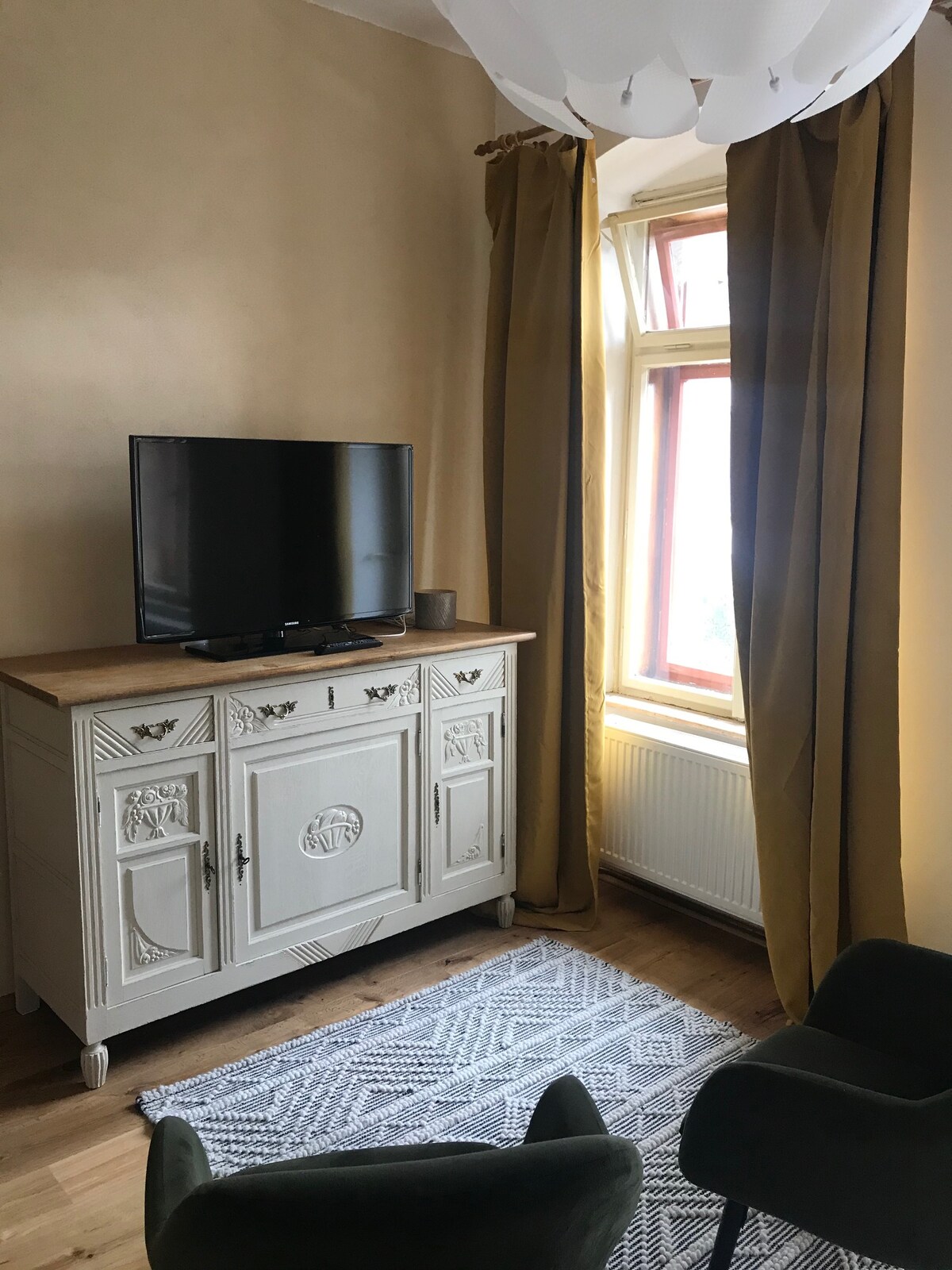 Byt se nachází v prvním patře nad pivovarem a cukrárnou, je velmi prostorný . V moderní koupelně je veliký sprchový kout , umyvadlo a záchod. Kuchyň s jidelnou nabízí vše potřebné pro přípravu jidla i příjemné posezení. Byt má krásný výhled na náměstí s gotickým kostelem a vzdálené Kozí hřbety. Veškerá vybavenost města (obchody, restaurace, kino, zastávka autobusu atd.) je vzdálená do minuty chůze z bytu. Byt je vhodný zejména pro rodinu s dětmi .