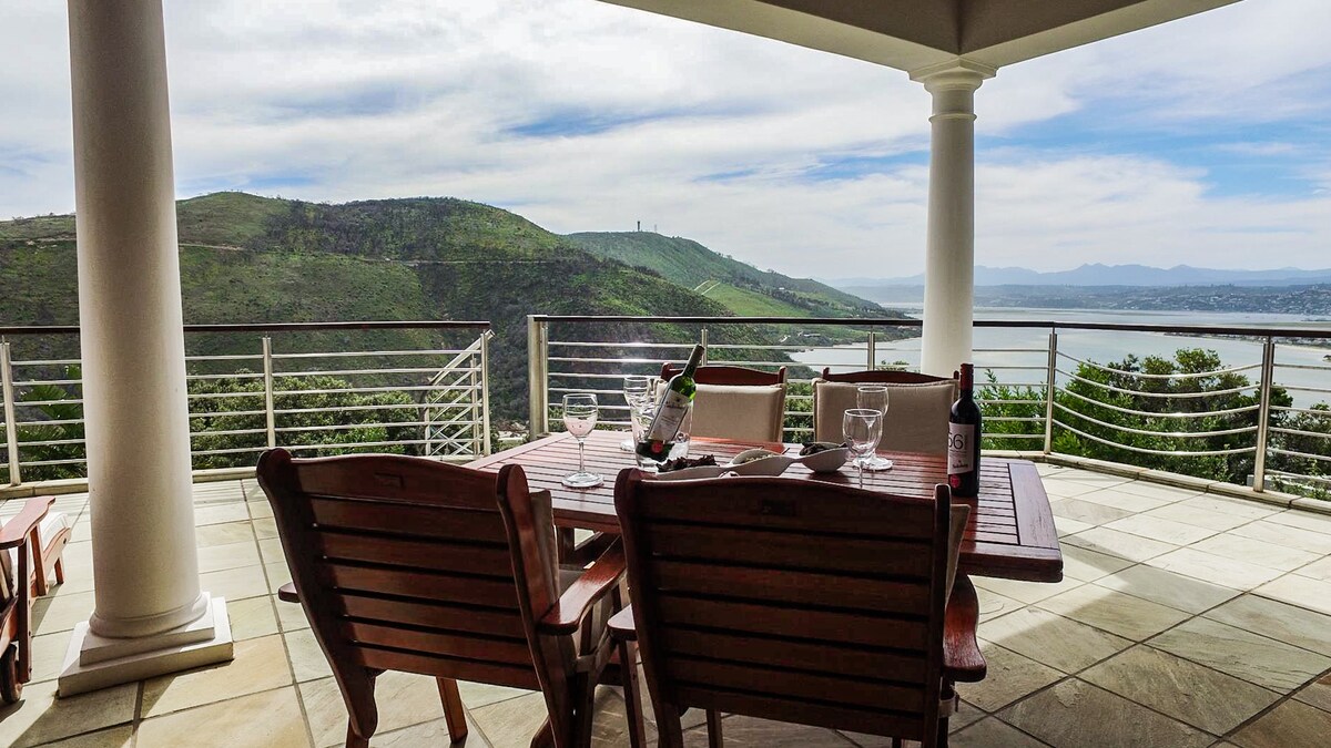 Panoramic view of old town and lagoon. Business travellers will love the freedom of no loadshedding and evening meals on their private deck. Walking distance to centre of town, Knysna Quays and lagoon. Positioned against the forest in a quiet cul-de-sac.