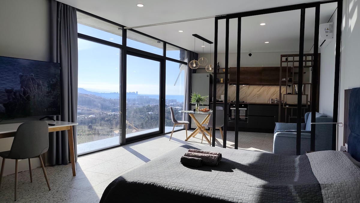 Sunset Studio | Crowne Plaza – Seaview Getaway More je udaljeno nekoliko koraka, centar Batumija je udaljen 10 minuta automobilom, a Botanička bašta je udaljena samo 2 km. Ovde ćete biti: - upoznajte zalaske sunca uz čašu vina! - Uživajte u čistom vazduhu okruženom zelenim planinama i divite se autentičnim gruzijskim brvnarama. - plivajte u moru danju i noću na plaži, gdje najmanje turista, osjećajući privatnost. - pogledajte saobraćaj grada izdaleka i shvatite da vas to ne brine.