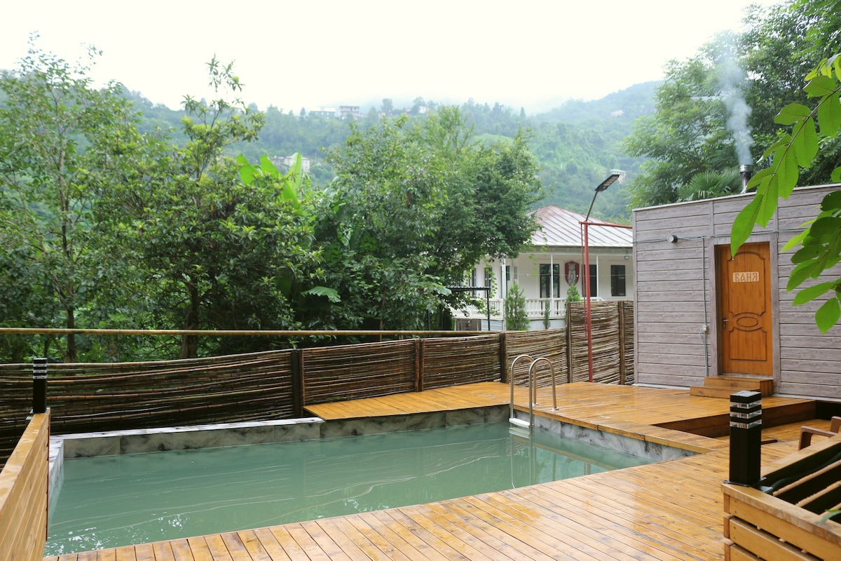 Seoska kuća na padini u blizini Batumija sa predivnim pogledom na planine i more, smeštena u mirisnom voćnjaku mandarina i narandži. Gosti mogu da uživaju u svežoj planinskoj izvorskoj vodi, domaćim lokalnim jelima i svežem medu iz našeg pčelinjaka. Dostupne su personalizovane ture sa vozilom visokom nivou za istraživanje regiona. Savršeno za porodice, prijatelje ili parove koji traže prirodu, mir i autentična lokalna iskustva