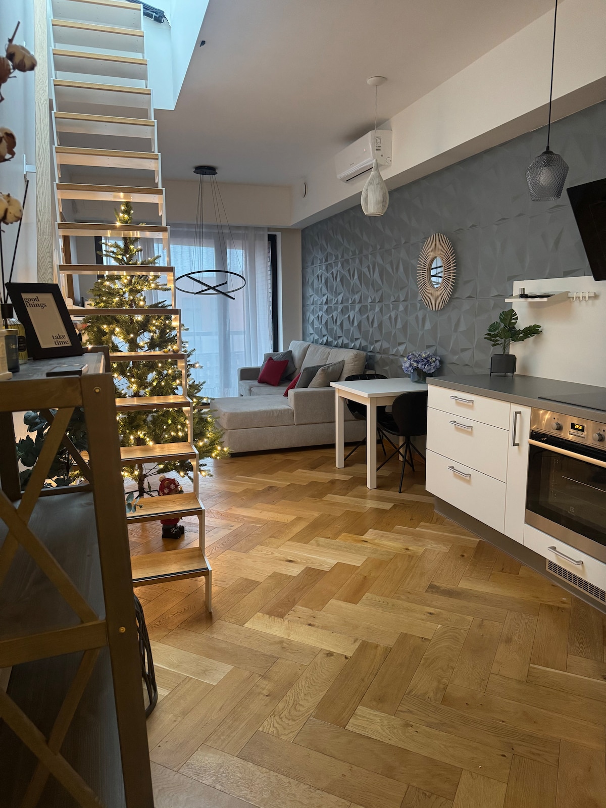 Klizite od spavaće sobe do saune, do otvorene terase u sofisticiranom stanu sa upečatljivim savremenim cvjetovima. Prozori se uzdižu do plafona visokog 5 metara, a kružna ogledala sjaje na svetlu. Parketni podovi i mekani tekstil dodaju dubinu i toplinu. Nekoliko minuta od Starog grada, potkrovlje je smješteno u elegantnoj stambenoj zgradi, odmah pored kreativnog centra Kultuurikatel. Istražite moderne, boemske četvrti Telliskivi i Kalamaja i jedinstveni Stari grad.