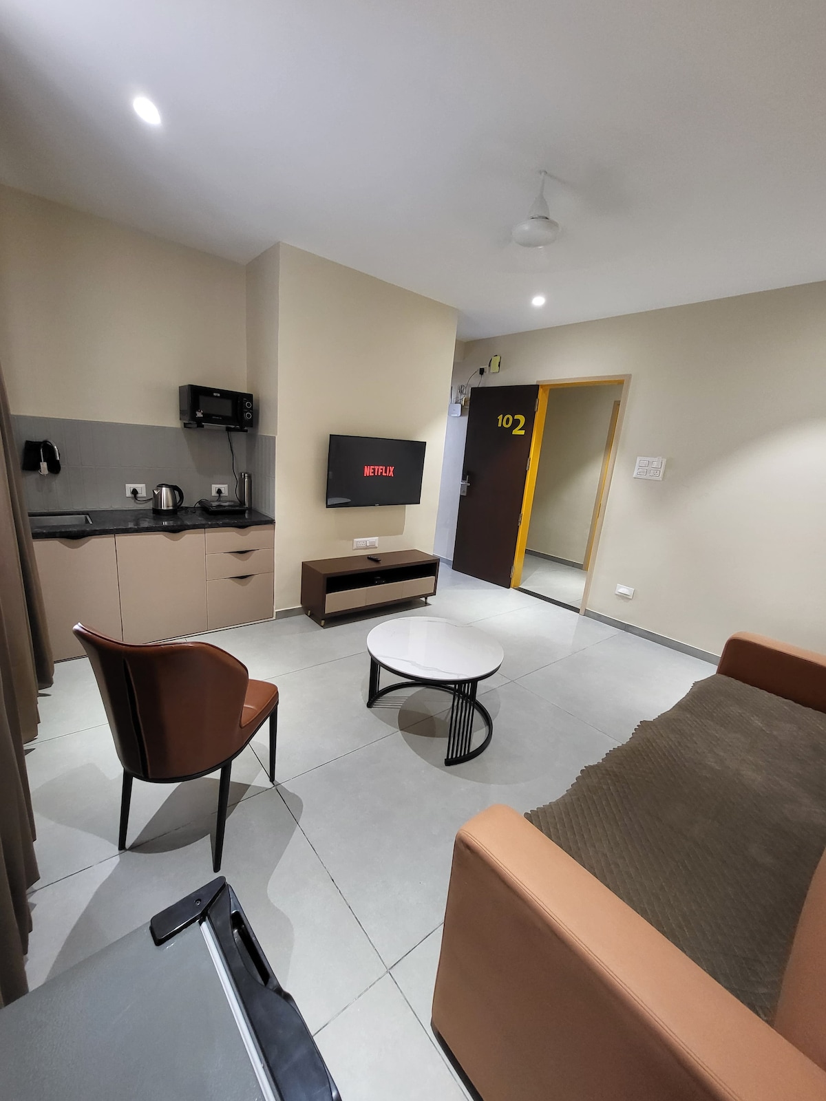 StayBird - Divine Suiites, where Family comfort meets modern luxury in our Premium 1 Bedroom Family Apartment. Spread out and relax in style with ample space including a cozy living area, 2 balconies offering scenic views, kitchenette for your convenience. Enjoy entertainment with two TVs and gather around the dining table. Unwind on the comfortable sofa after a day of exploring Pune's attractions. Perfect for families or groups, We offer a comfortable retreat in the heart of Kharadi.