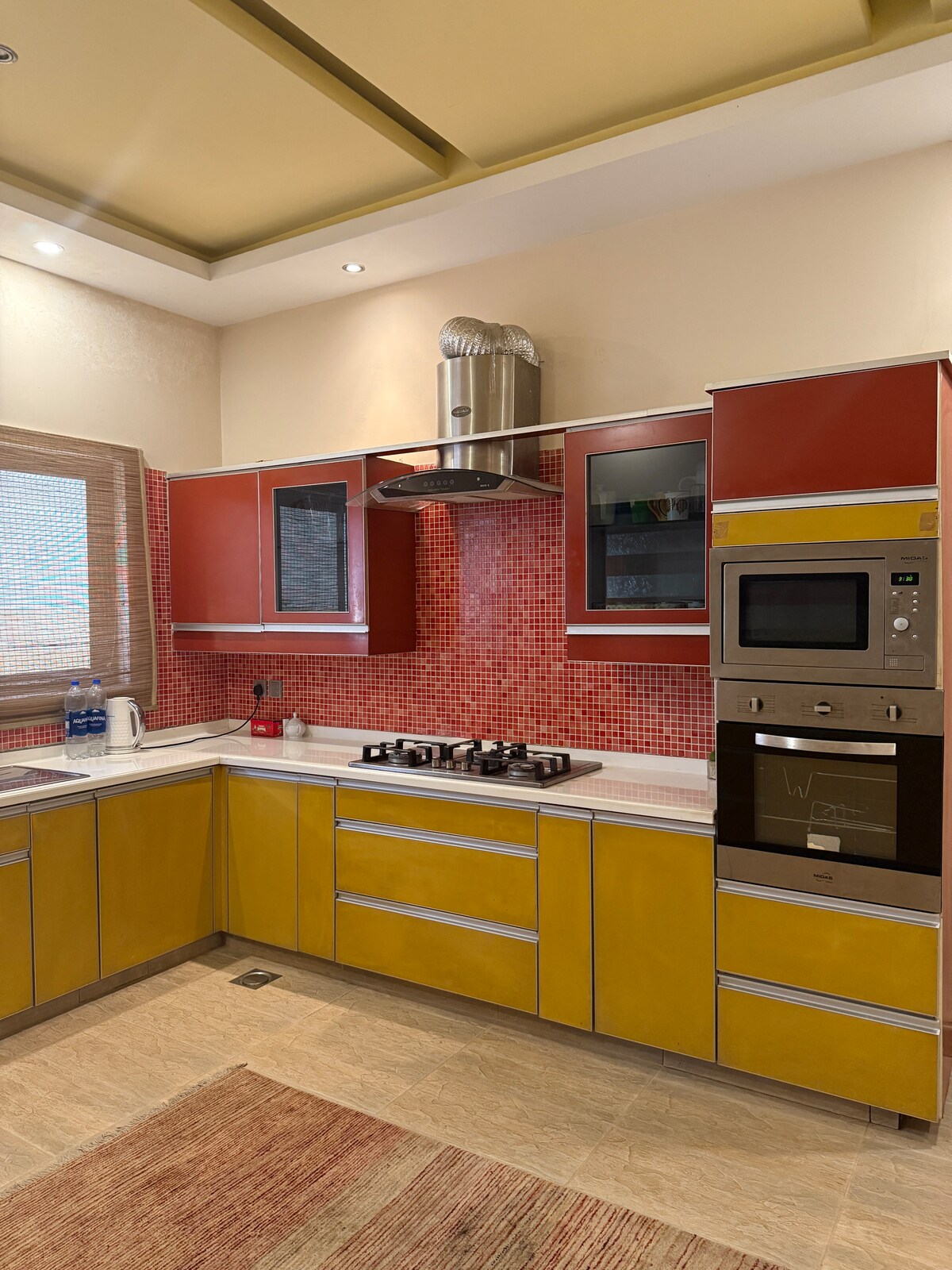 Spacious 1 Kanal luxury home with 6000+ sq. ft. covered area. Features 4 en-suite bedrooms, 2 fully equipped kitchens, large private garden, and cozy TV lounge. Ideal for families or groups seeking comfort and privacy. Housemaid available on request. Peaceful, secure location — perfect for short or long stays. 20 minutes from McDonald, V Mall and other Restaurants.