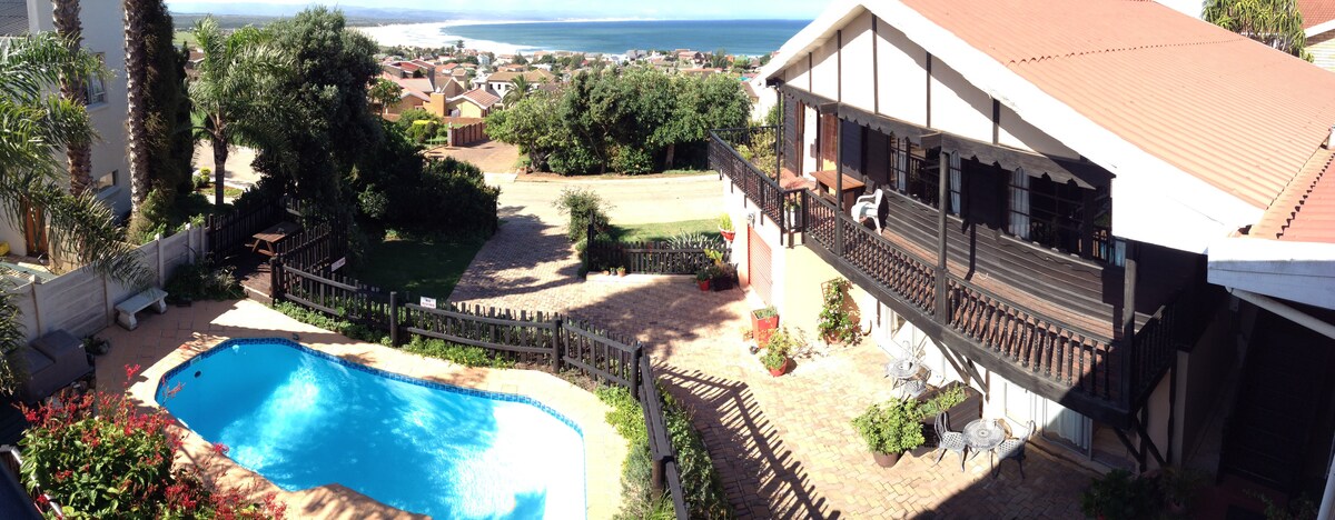 Wake up to sweeping views on far-stretching ocean,A double story building ,two bedrooms ,full bathroom ,down stairs kitchenette lounge ,tv,dvd stoep. A perfect setting for a blissful honeymoon.Swimming pool.Breakfast optional R120 pp solar power,