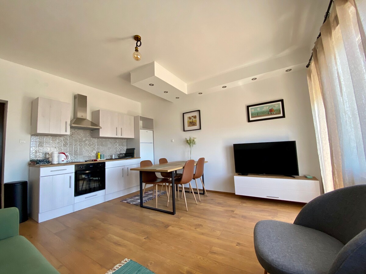 This beautifully decorated -with-love, renovated apartment has one bedroom, but it can comfortably fit four people (there is one double and one single person bed in the bedroom and a couch for two in the living room). Located on the first floor, 100 m from the sea promenade, 10 min walking to the nearest Queens beach and 3 min walking to the old city. There are restaurants and markets nearby. It includes a TV, couch, full dining table and a balcony. The kitchen is fully equipped for cooking.