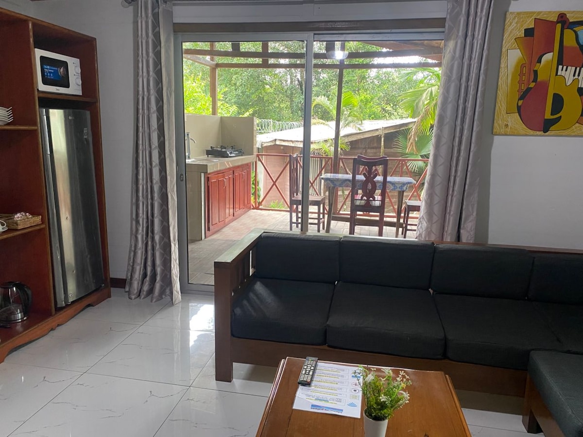 résidence de 6 appartements à proximité de la plage et de la ville de kribi au cameroun. la résidence dispose d'une piscine privée, les 6 appartements ont chacun un salon, une cuisine équipée, 2 salles de bain, 2 chambres a lit double. Le prix afficher de la nuitée est celui d un appartement de 02 chambres.