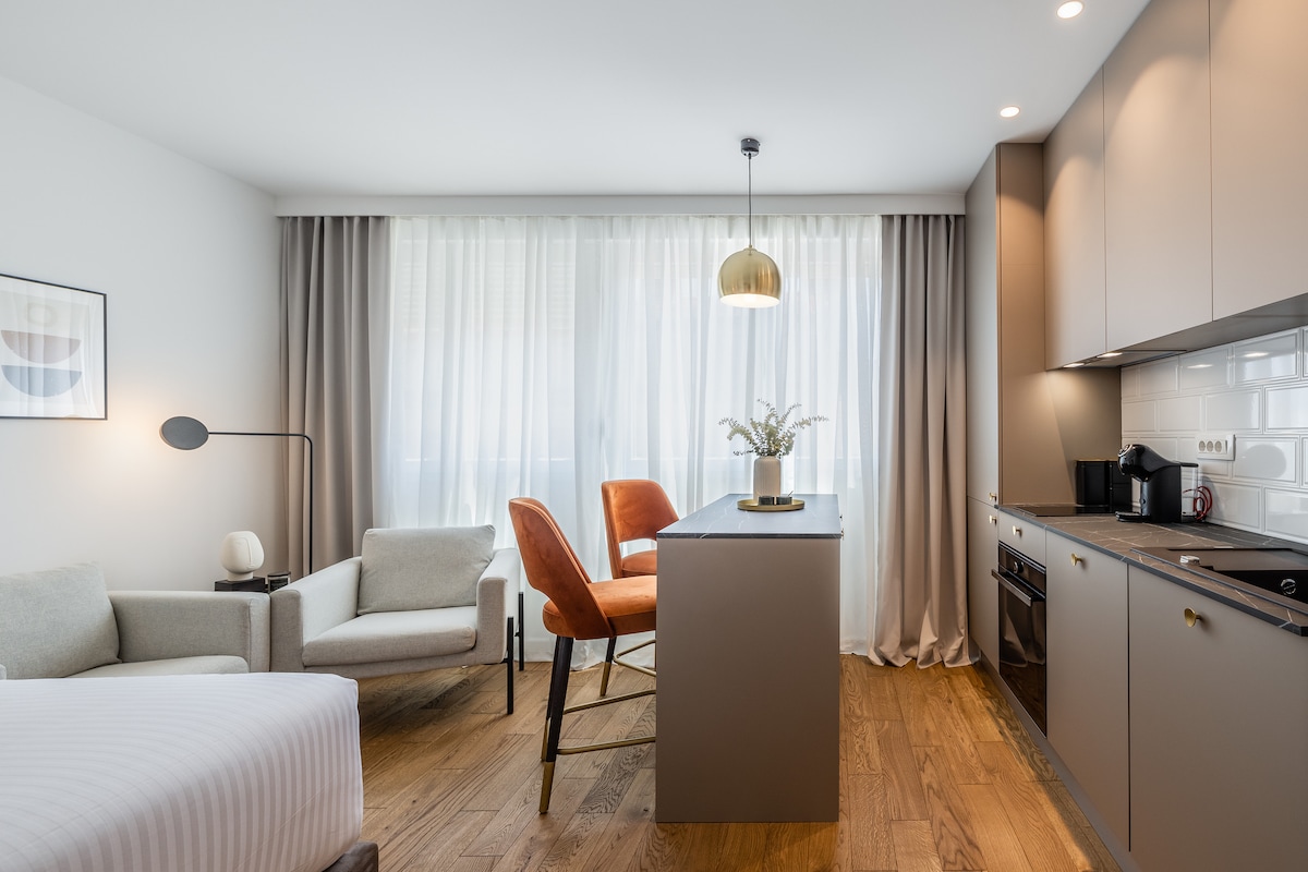 Dovedite ujutro u elegantne utočišta u kuhinji sa minimalističkim elementima dizajna i betonskim površinama. Nakon što provedete dan istražujući grad, opustite se uz čašu vina usred svijetlih drvenih podova i modernog namještaja u dnevnom boravku.