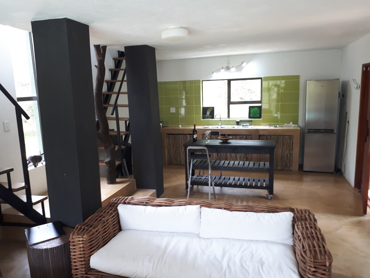 A self catering, bush haven in the big five Mjejane Game Reserve, part of the Greater Kruger National Park. Magnificent view up Hector Spruit (small river), surrounded by Leadwood, Jackalberry, Wild Fig & Marula Trees, resident Eagle Owls, Hammerkops, a Pearl Spotted Owlet, numerous Kingfishers, Water Monitor and Crocodiles. Relax on the patio & in the pool, while watching the animals as they come for a drink. Spoilt for choice from the big 5 to an abundance of birds.